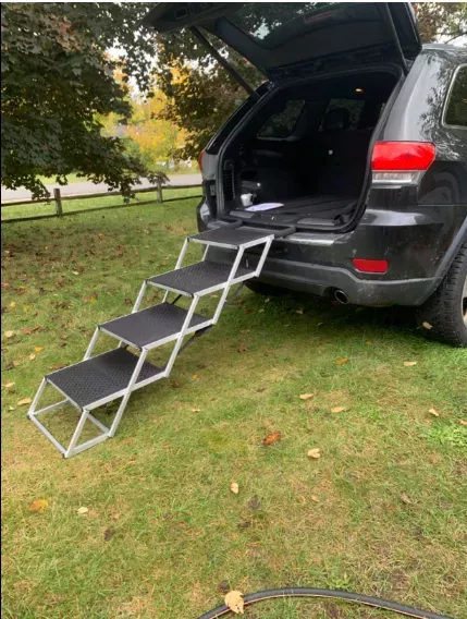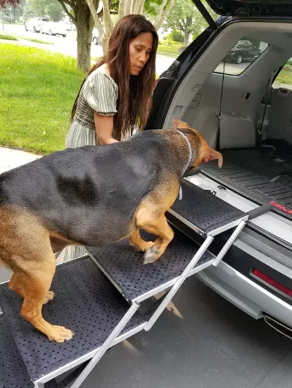 Alright, let's talk about this awesome product. I've got a pretty big pooch at home and he absolutely loves car rides. But he's gotten older, it has been harder for him to hop in and out of the vehicle like he used to. It was really starting to bum us both out. Then I found this magic solution! Now my furry buddy can get into the car without any trouble at all. And when we're done with our adventures, he can just stroll right back out again too. It’s made road trips fun again for both me and my four-legged friend! And you know else is seriously cool? The non-slip surface on this thing! This is such a huge plus because it gives me peace of mind knowing that my dog won't slip or fall while using it. He feels more confident getting in and out of the car now knowing that his paws aren’t going to slide from under him. So yeah, if you have an older or larger dog who struggles with getting in and out of cars, then you need to check this product out ASAP! You'll be doing yourself - but more importantly your best fur-friend - one heck of a favor. It's not only practical but also safe which makes it even better value for money. So don’t wait around – grab one today! Trust me; your canine companion will thank you later with lots of love-filled licks! 👍