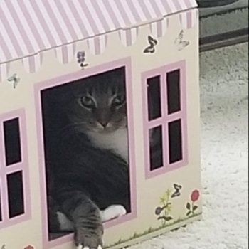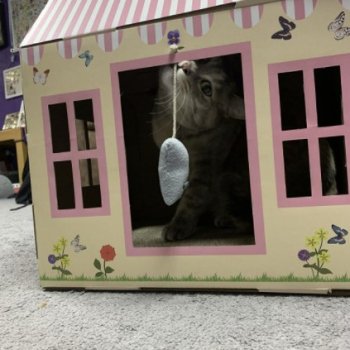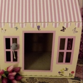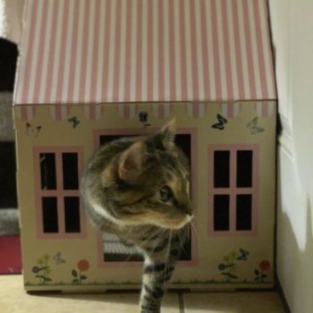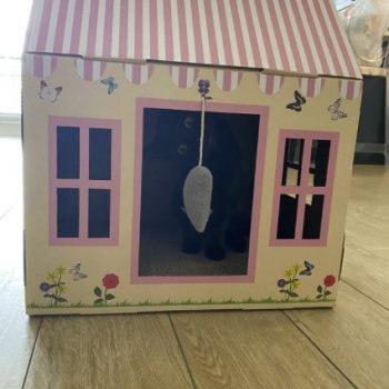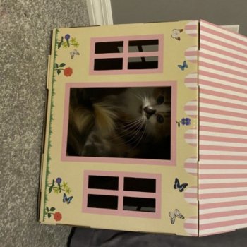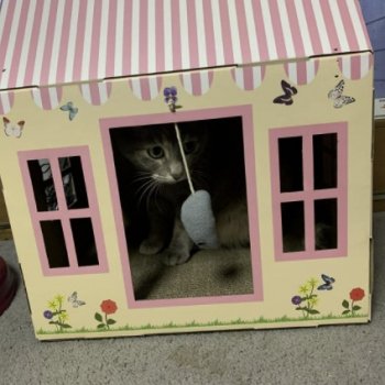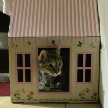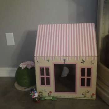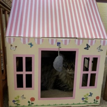The house measures 20″ tall (to the peak of the roof), 16″ wide, and 13″ deep with an 8” T x 5.5″ door opening. Features a cute design with a pink striped roof and butterflies & flowers on the sides. Includes 4 windows for your cat to peek through!