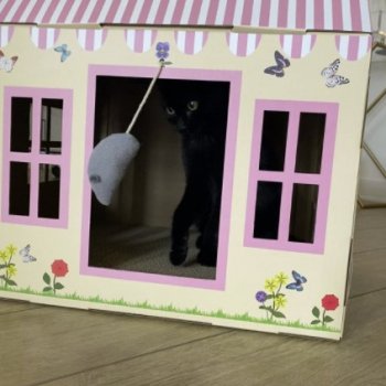 The cat scratcher features a cute cottage house design that provides an enclosed space for cats to lounge in or relieve their scratching needs in privacy; it also comes with a detachable hanging toy for additional entertainment.