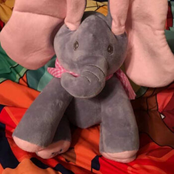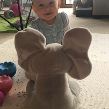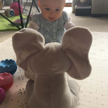 I found this elephant on lightening deal and it had great reviews. I decided to get it for my newborn and she loves it. I use it for when I change her diaper. it sings a song and also plays hide and seek. It’s ears come down over its eyes and then back to normal. It is very cute and babies love it! It is a decent size as well.