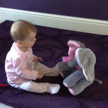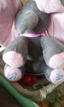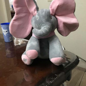It was gifted to my almost 4-month-old son for Christmas this year. The voice of the elephant is very sweet and not annoying like some toys. It is a loud volume and piques the baby’s interest. The ears cover the eyes and pass for a second before opening up. I like that it has buttons on the feet for singing or playing. It is crazy soft. So soft I almost dropped it a couple of times lol.